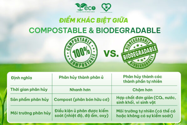 Biodegradable chỉ quy định sau khi chuyển hóa bởi vi sinh vật, sản phẩm sẽ biến đổi thành CO2, nước và sinh khối hữu cơ. Trong khi đó, các sản phẩm Compostable có thể phân hủy hoàn toàn thành CO2, nước, hợp chất vô cơ, mùn tốt cho môi trường phù hợp để nuôi cây trồng.